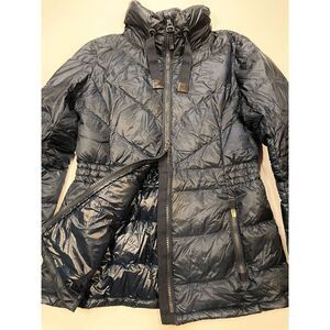 tags: women's winter fall outerwear jacket fitted quality GAP owned athletic athleisure brand quilted down filled jacket EUC quality fashion brand athletic athleisure blue navy blue dark blue rich blue excellent used condition winter weather warm cozy fitted slimming