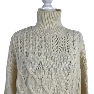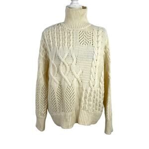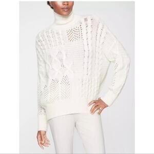 Athleta Bedford Cashmere Wool Cable Knit Turtleneck Sweater Dove Off White Small fisherman sweater