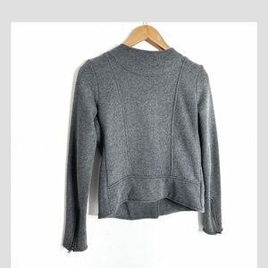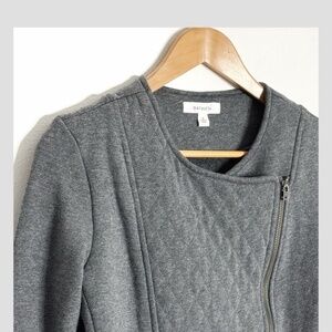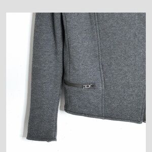 Style Tags: Athleta Belvedere Moto Jacket, grey jacket from Athleta moto edgy zip sleeves, fleece lined size small Athleta zip up small