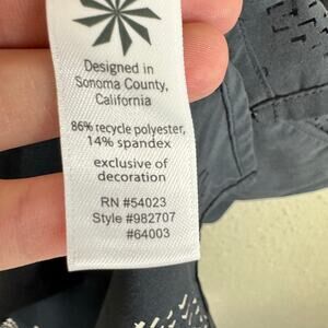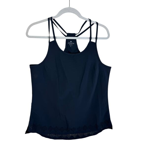 Excellent preowned condition, has mark on Athleta tagless writing, not visible from outside. Athleta Black Lightweight Strappy Racerback Eyelet Hem Athletic Tank Top. Recycled polyester/spandex material. Approx. measurements: Shoulder to hem 27", pit to pit 19". Size L.