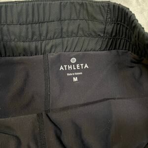Skims over body for a just right fit. Sits below natural waist. For running, gym, training. 1 secure back zip pocket. Water repellent. Light weight silky feel sleek fabric. Logo front bottom. Built-in ventilation for air flow. Wide leg opening + longer inseam for mobility + coverage. Size medium. Color is black. Like new condition.