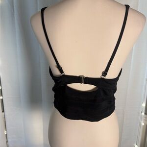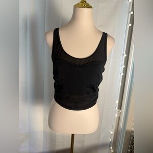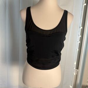 Sleek black sports bra. Mesh detailing. Comfortable fit.