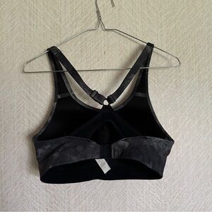 This bra has a dotted tie dye like print to it. It has a two clasp closure in back.the front is thicker for built in support. No removable pads