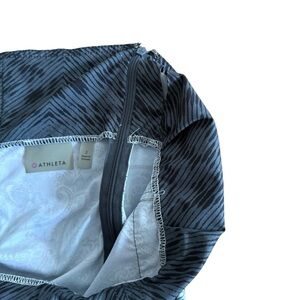 This elegant sundress by Athleta showcases a sleeveless halter neckline, ideal for a night out. The dress features a striking contrast between its solid black top and a flowy green patterned midi skirt, offering a sophisticated and stylish look.