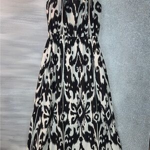 This Athleta sundress showcases a bold black and white geometric print, ideal for casual resort wear. The sleeveless design with a halter neckline offers a breezy and elegant look. Its maxi length and flowing silhouette ensure comfort and style in warm weather.
