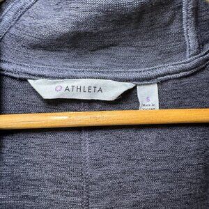This is a women's Athleta hooded cardigan sweater in size Small, featuring a solid gray color with raglan sleeves and an open front design. Made of polyester and spandex, it offers a comfortable fit. The cardigan is perfect for adding a layer of warmth and style to your outfit.