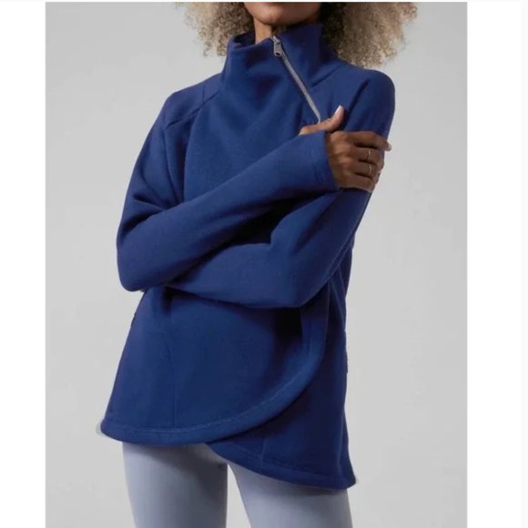 Cozy blue crew neck sweater. Features a stylish zip detail. Perfect for layering.