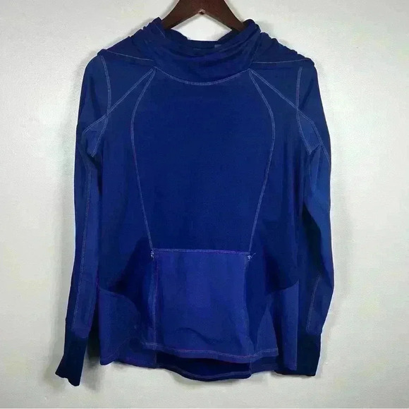 Athleta blue long sleeve hooded pullover sweatshirt. This comfortable top features a stylish cowl neck design and a kangaroo pocket. The athletic stitching adds a touch of detail. Perfect for workouts, errands, or casual outings.