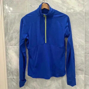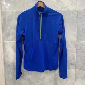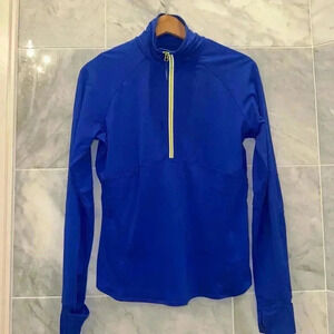 Excellent condition quarter zip royal blue top by Athleta. Neon yellow zipper, long sleeves with thumb hole cutouts, crew neck.