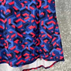 Women's racerback tank top by Athleta. This blue and red sleeveless top has a geometric print, a scoop neck, and a high low hem. It is a polyester spandex blend.