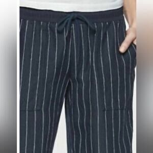 Athleta Bali Linen High-Waisted Cropped Blue and White Striped Pants, size 6. Excellent preowned condition. 100% linen. Stretch waistband with tie closure. Side and back pockets. Please see photos for measurements.