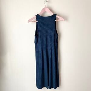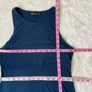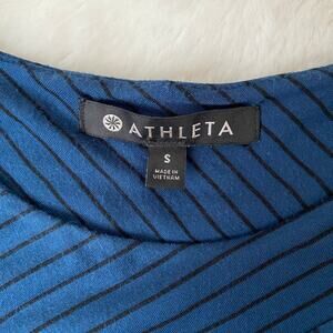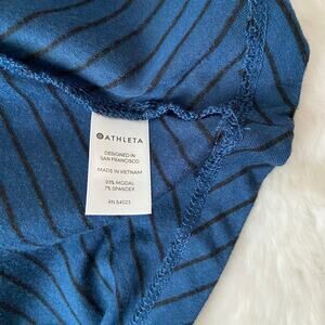 Blue and black stripe tank top dress by Athleta. Comfy and stretchy fabric. Great preowned condition. Size small. Measurements in photos.