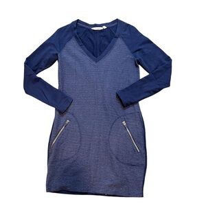 Athleta Blue Striped V-Neck Long Sleeve 71% Nylon Knee Length Dress Size XSP