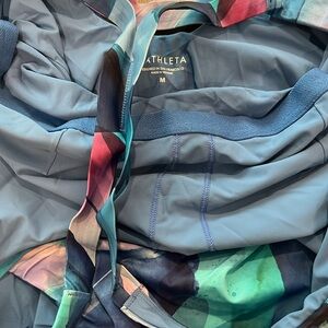 Stylish one-piece swimsuit by Athleta. Features a vibrant blue and pink pattern. Perfect for swimming and beach days.