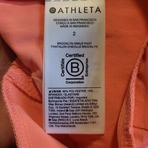 Athleta Brooklyn ankle pants in the color sunset glow coral, size 2. Features: Featherweight stretch, secure pockets in back, and wrinkle resistant. NWT, never been worn. No flaws.