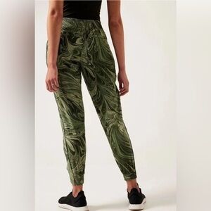 Athleta Brooklyn Jogger High Rise Pants Sumi Marble Green Size 10. Stylish olive swirl design. Comfortable fit for everyday wear. Ideal for casual outings. Made from a blend of recycled polyester and spandex, offering breathability, lightweight feel and stretch. Machine washable. Elastic waist.