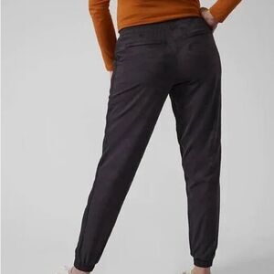 Experience ultimate comfort and style with Athleta's black joggers, featuring a relaxed fit and elastic cuffs for a modern athleisure look. Perfect for casual outings or light activities, these track pants offer a sleek silhouette and a soft, cozy feel.