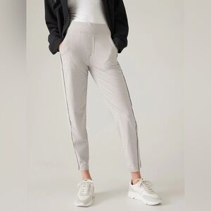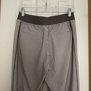 Like new pair of Brooklyn Textured Ankle Pants from Athleta in a size 6. These pants are a beautiful grey and white stripe pattern. They have an elastic waist with a pull on styling with hip pockets. Ankle length. No stains or flaws!