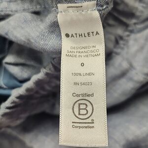 Get ready for your next coastal adventure with these Athleta Cabo Linen Wide Leg Pants in Blue. These pants are perfect for any occasion whether you're going to a party, traveling, or just running errands. The pull-on style and elastic waist make them comfortable and easy to wear while the lightweight and breathable fabric ensures you stay cool on hot summer days. These pants feature a flat front, high rise, and wide-leg design that gives them a relaxed fit. They also come with pockets for added convenience. The chambray fabric type and solid pattern add a touch of bohemian style, making them perfect for a beachy or coastal theme. These pants are available in size 0 and are suitable for women of all ages.