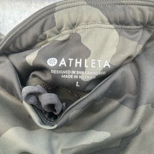 Athleta Sleek camo design. Ideal for workouts. Comfortable fit. Athleta Camo Contender 7/8 Leggings Size Large Zipper Pockets Green Black
