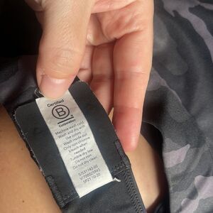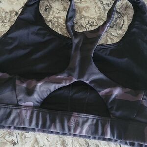 Stylish camo print sports bra. Racerback design. Comfortable fit for active wear.