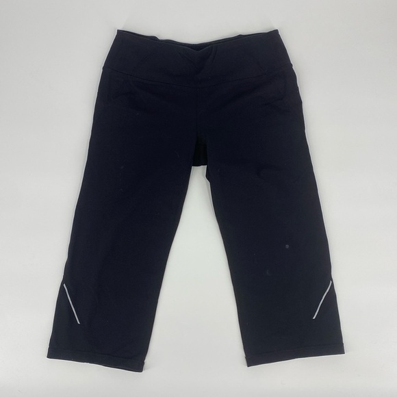 All about Athleta! These black capris are versatile and are by such a popular brand. They are a size S and feature a small zipper pocket in the back. RN#54023 and the Body is 87% Nylon/Supplex 13% Lycra, the Waist Band Insets is 87% Nylon 13% Spandex and the Gusset coolmax is 100% Polyester.
