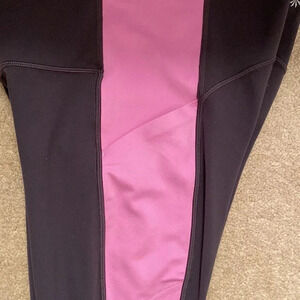 These are Athleta cropped leggings. They are dark gray and pink. Has the logo on the back top of leggings. There is also a pocket o the side thigh of the legging. Inseam is 24 inches.