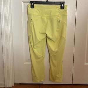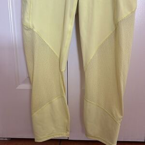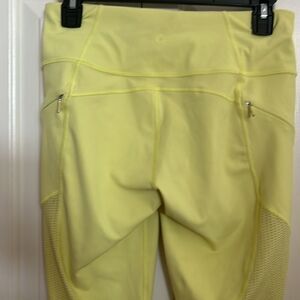 Polyester and Spandex. 2 zipper pockets. Small pocket in the waistband. Mesh panels on the legs. Waist measure is 26 inches, unstretched. Inseam is 21 inches.