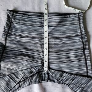 Athleta, sz M, high rise striped spacedyed Chaturanga Tight. Black and white stripped leggings. Wicking material with 4 way stretch. Full length leggings with a 28 inch inseam. Excellent used condition. No noted flaws.