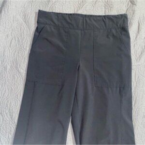 The ultimate travel companion for every adventure with wrinkle-resistant, recycled Featherweight Stretch™ fabric that gives you built-in breathable sun protection (it's UPF 50+) and great pockets for stashing necessities on the go. Semi fitted, mid rise (by Athleta website, I would consider them high rise, see measurements), wide leg stretch casual pant in black.Plain front wide waistband with back elastic, large deep front pockets.