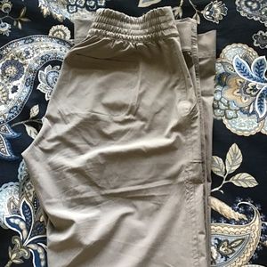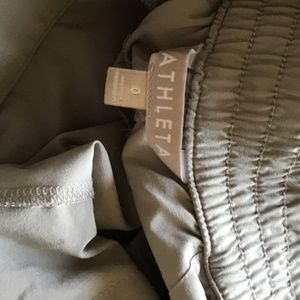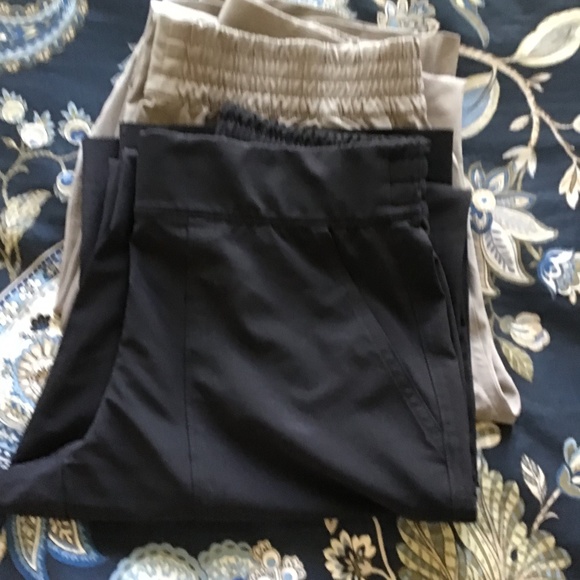 Athleta Chelsea wide leg in colors tan and black in size 0. Feather weight pants that are perfect in summer, travel, golf, work, dress up or casual. They wash and dry quickly. These fit bigger so it would also fit a size 2. These pants are gently used and I will wash before shipping. These pant go for $80 new and selling two for one price of $50.