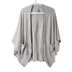 Athleta cocoon cardigan in women’s size XS. A soft and cozy open-front wrap with a draped cocoon silhouette, short dolman sleeves, and two slouchy front pockets. Lightweight heathered beige/oatmeal knit made from a Tencel® blend with stretch for comfort. Perfect for layering over activewear, lounge, or casual outfits.