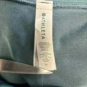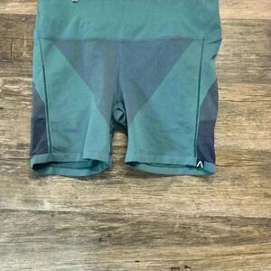 These Athleta bike shorts feature a teal waistband, slate gray middle section, and charcoal gray hem. Made of lightweight, moisture-wicking material with a wide elastic waistband for comfort during exercise.