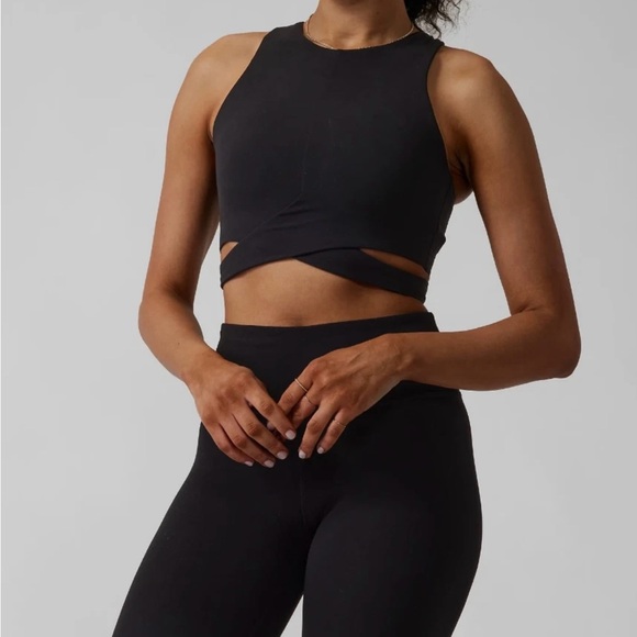 This NWT (New With Tags) Athleta Conscious Cut Out Crop Top Sports Bra is a low-impact sports bra designed for studio activities like yoga, barre, and pilates. It features a buttery-soft, compressive Powervita™ fabric, a cropped silhouette, and a built-in bra with removable pads. It offers breathability, quick-drying, and wicking properties, with a racerback design for mobility and airflow.