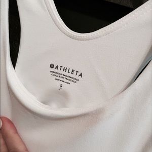🤩 NWT Athleta Conscious Support Top in white. Brand new. Only tried on a few times. Buttery soft workout top with built in bra with light padding. I did get a makeup mark on neckline as shown in picture. Should come out in wash- I just did not want to wash it myself before selling.