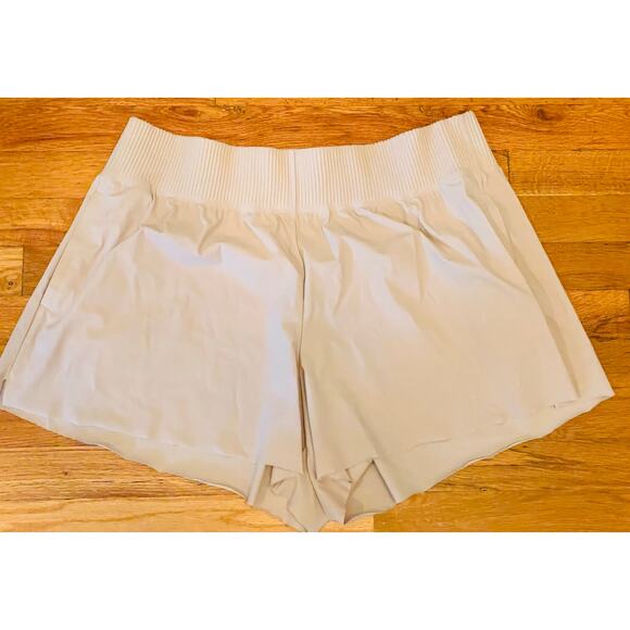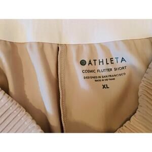 Athleta Women's Size XL Beige Cosmic Flutter Pull On Shorts, Style # 566663-01, 68% Nylon 32% Spandex, Stretch. Ribbed Elastic Waist, Zipper Pockets, Raw Edge Hemlines. In very good pre-owned condition.