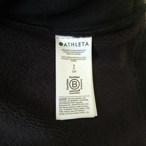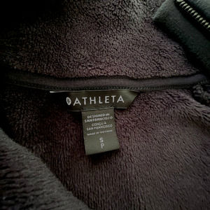 Athleta Cozy Karma Asym Pullover Fleece Sweatshirt Black Size S Petite. In good pre-loved condition. Does have small stain/discoloration on front bottom area (pictured) and also has some pilling (also pictured).