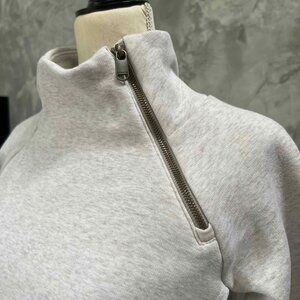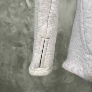 The Athleta Cozy Karma sweatshirt in heather cream is a comfortable and stylish fit. It will keep you warm but ventilated with the open zipper neck detail and open petal front. Zipper pockets for performance and a tailored fit. In excellent pre-owned condition, no flaws.