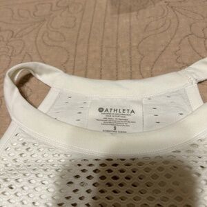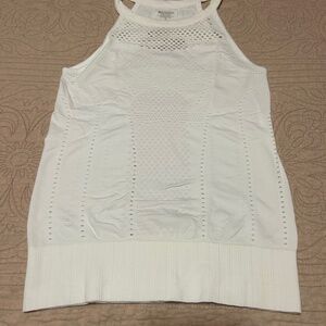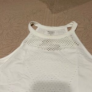 Great condition. Size S. Very cute. Stretchy. Could wear to workout in. Has eyelet throughout the top. Could wear under a shirt. Round neck sleeveless. Measurements are pit to pit 14. Length is 23.