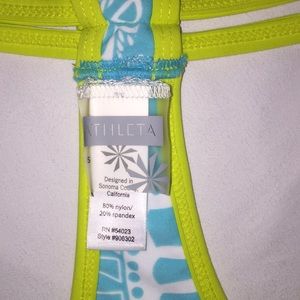 New Athleta cropped yoga bra top features a teal and white nylon/spandex print with chartreuse trim.