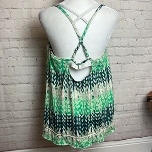 Green, white and grey printed crossback tankini top in blousy silhouette. Adjustable straps. Bralette style - removeable pads are NOT present. Bottom has adjustable tie.