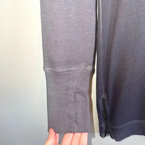 Athleta dark gray side zip sweatshirt dress. In excellent condition! Crew neckline. Thumbholes in the cuffs. Long sleeves. Straight bottom hemline. Functional zippers on both sides of the hemline. Knee-length. Unlined. Lightweight sweatshirt-y material. Dark gray color. Size small.