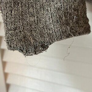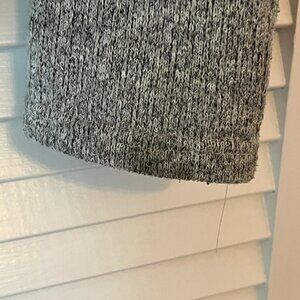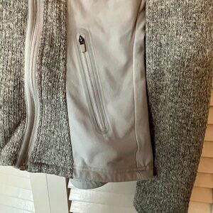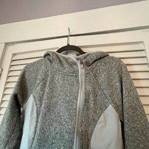Athleta Daybreak hooded jacket. Full zip in front. Women's size small. Grey color with lighter grey accents. Pre-worn. Flaw on each cuff: One sleeve cuff is starting to unravel, and the other has a stain. See close-up photos.