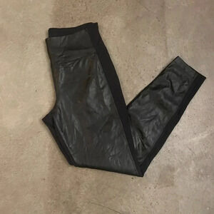 Faux Leather front with flattering seam down the back in knit fabrication zip pockets on the back. Perfect with an oversized graphic tee and denim jacket. Dress it up for the holidays with a cozy sweater.