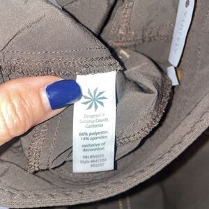 These Athleta Cargo Capris in women's size 8 are perfect for outdoor activities like hiking. They are silky soft and comfortable and have a bit of stretch. The brown capri has lighter brown contrast stitching which adds a stylish touch to the practical design, while the polyester and spandex blend material ensures comfort and flexibility. With a straight leg style and flat front, these pants offer a flattering and functional option for adventurous women on the go.