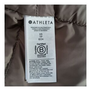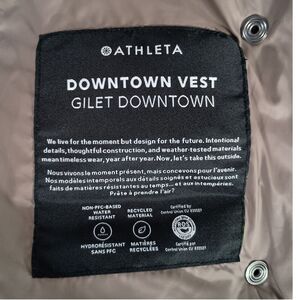 The Athleta Downtown Gilet Puffer Vest is a stylish and functional women's garment perfect for the colder seasons. Made with a polyethylene outer shell and filled with warm goose down insulation, this metallic bronze vest offers both comfort and style. The quilted design adds a touch of texture, while the mid-length cut and zip closure make it practical for travel and casual occasions. This Athleta vest is machine washable and features a soft nylon lining, making it a convenient and fashionable choice for the winter, fall, and spring seasons. Pit to Pit: 18", Length: 26"
