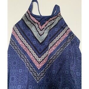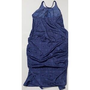This Athleta dress is a stunning addition to any wardrobe. Featuring a beautiful blue mosaic print with geometric patterns, this knee-length dress is perfect for any occasion. The dress has a round neckline and is sleeveless, with a pullover closure. It also has a built-in bra for added support and comfort.