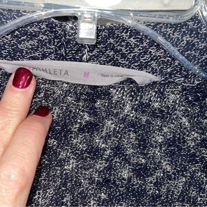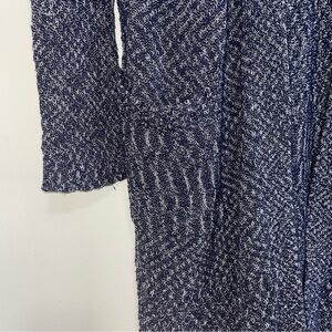 This is a navy and white Athleta Duster style cardigan. There is a pocket on each side. On the back there is one straight white line of threading, it is not a pull but I noticed it during photos and wanted to point it out.