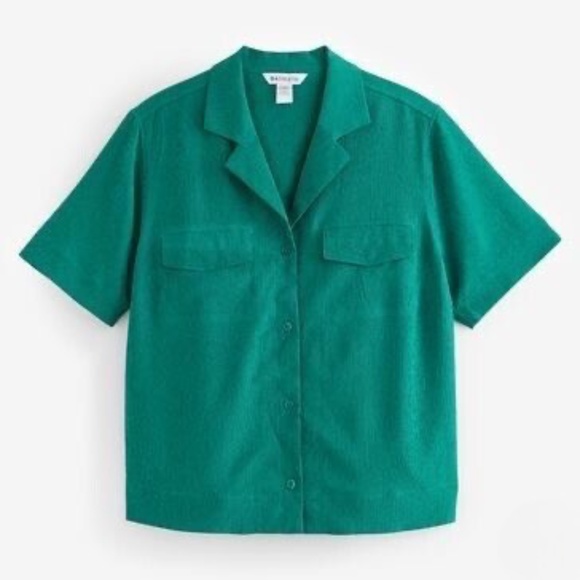 FIT: Short sleeves, revere collar, button-through front, front pockets. Relaxed, easy fit.