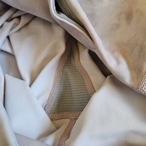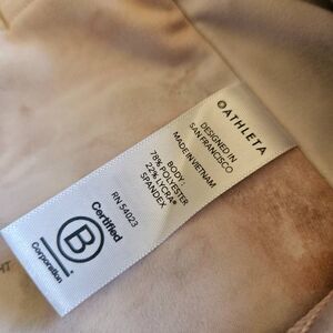 This is a pair of the elation style 7/8 tights by Athleta. The color name is snow dye, and they have pink and grey tones. Inside of the waistband is a small hidden pocket.